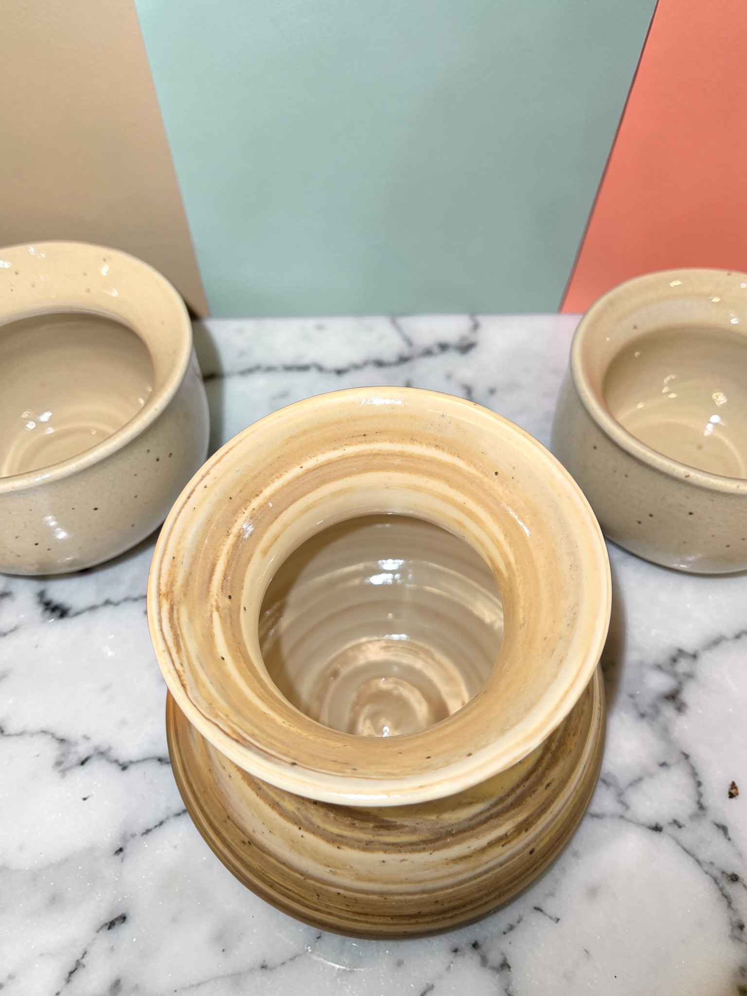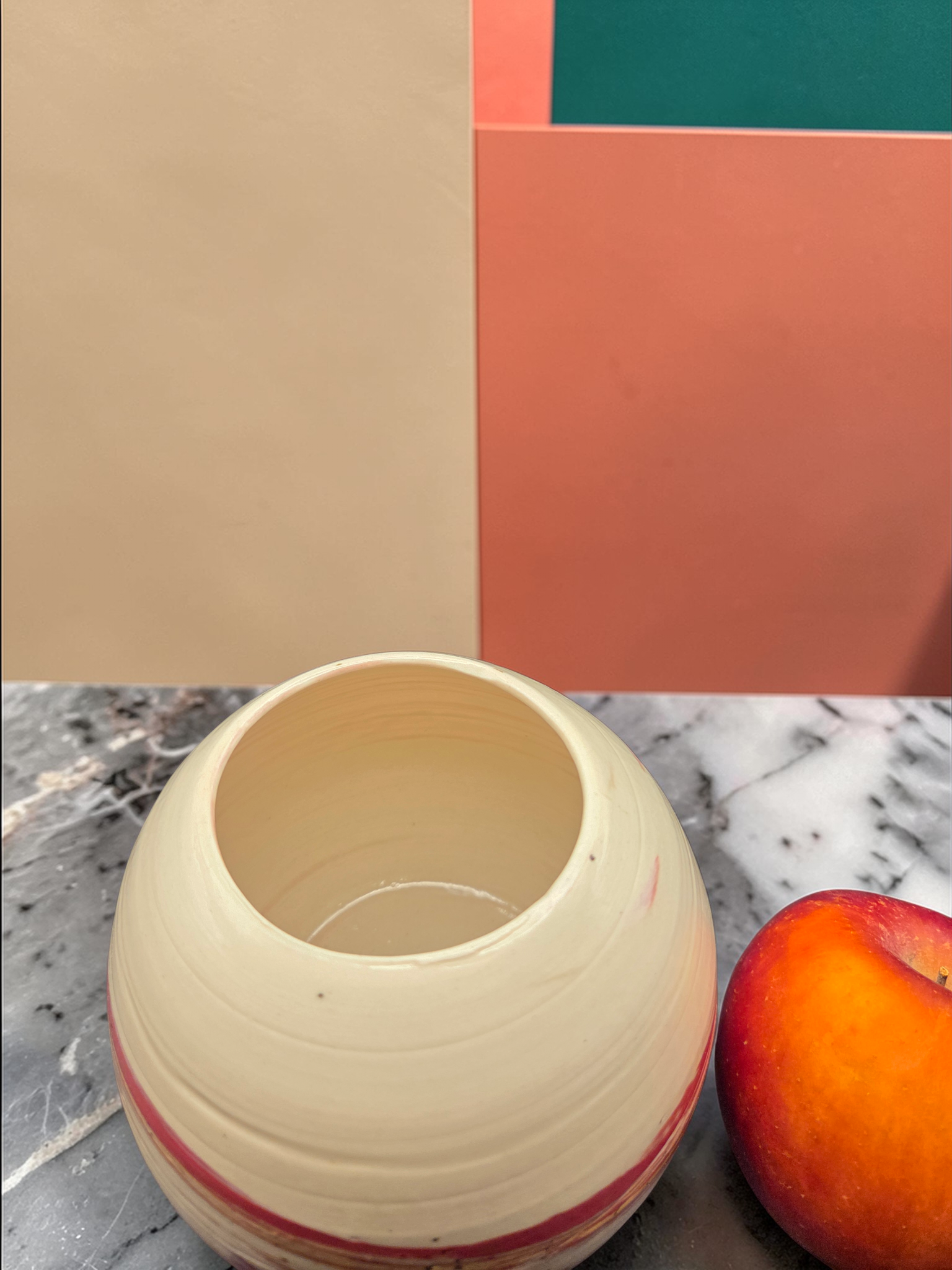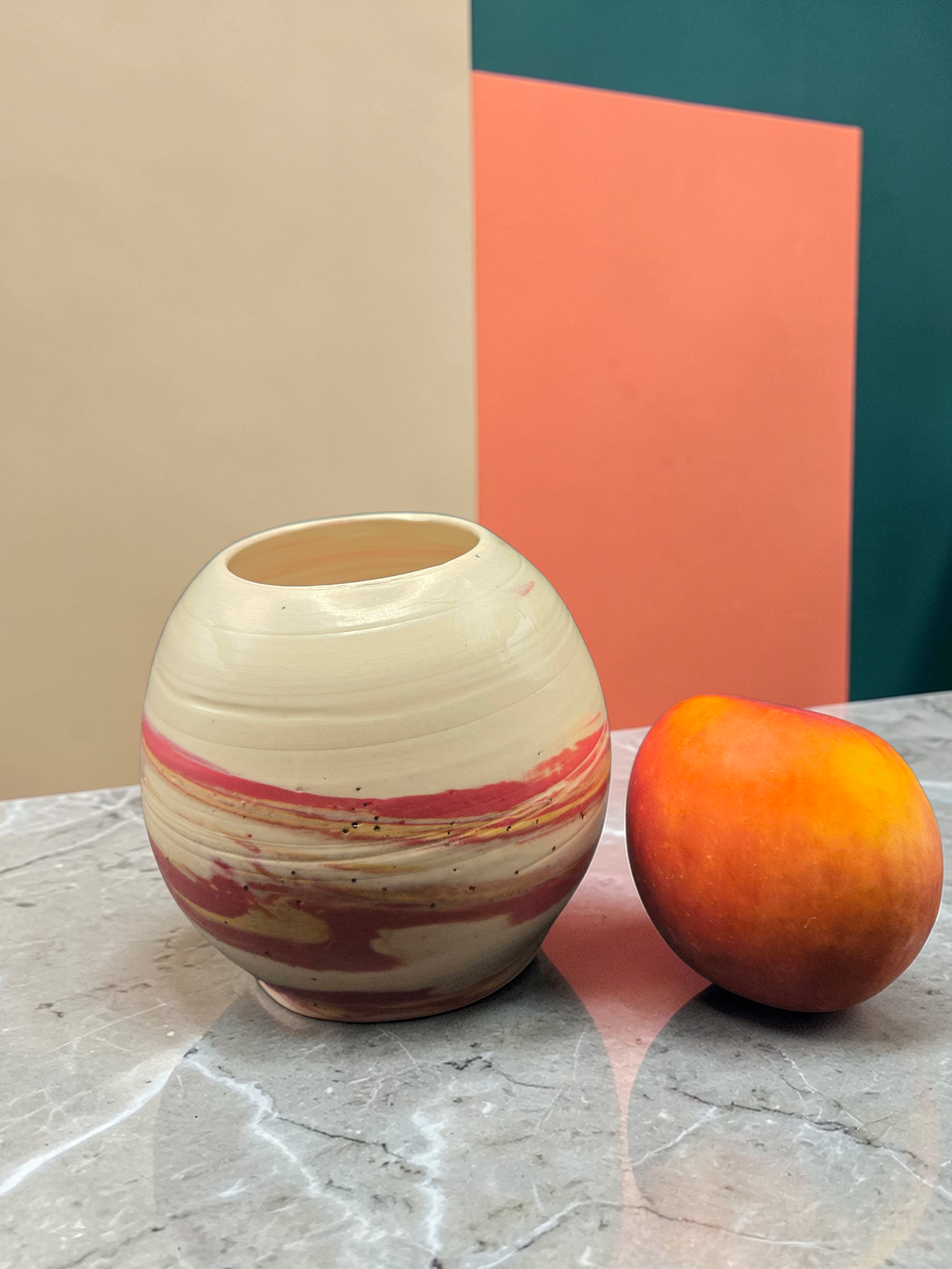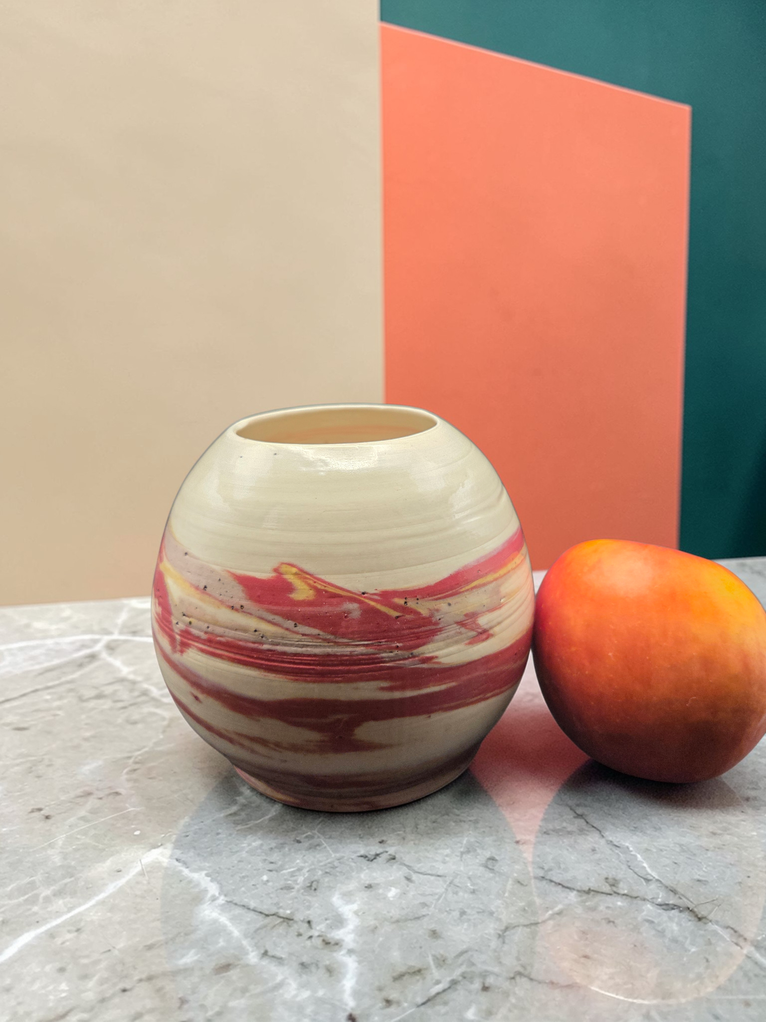 A lively statement piece crafted by Debbie Sharp in Gresham, Oregon. This chattered vase blends bold red, sunny yellow, and clean white clays using colored-clay techniques, then texture is applied with rhythmic chattering marks that catch light and emphasize the layered colors. Hand-thrown and finished with a clear glaze and suited for fresh or dried stems or as an independent sculptural accent. Each vase is one-of-a-kind: small variations in pattern and color are part of the handmade character. Ideal for adding a bright, contemporary touch to shelves, tabletops, or entryways.
