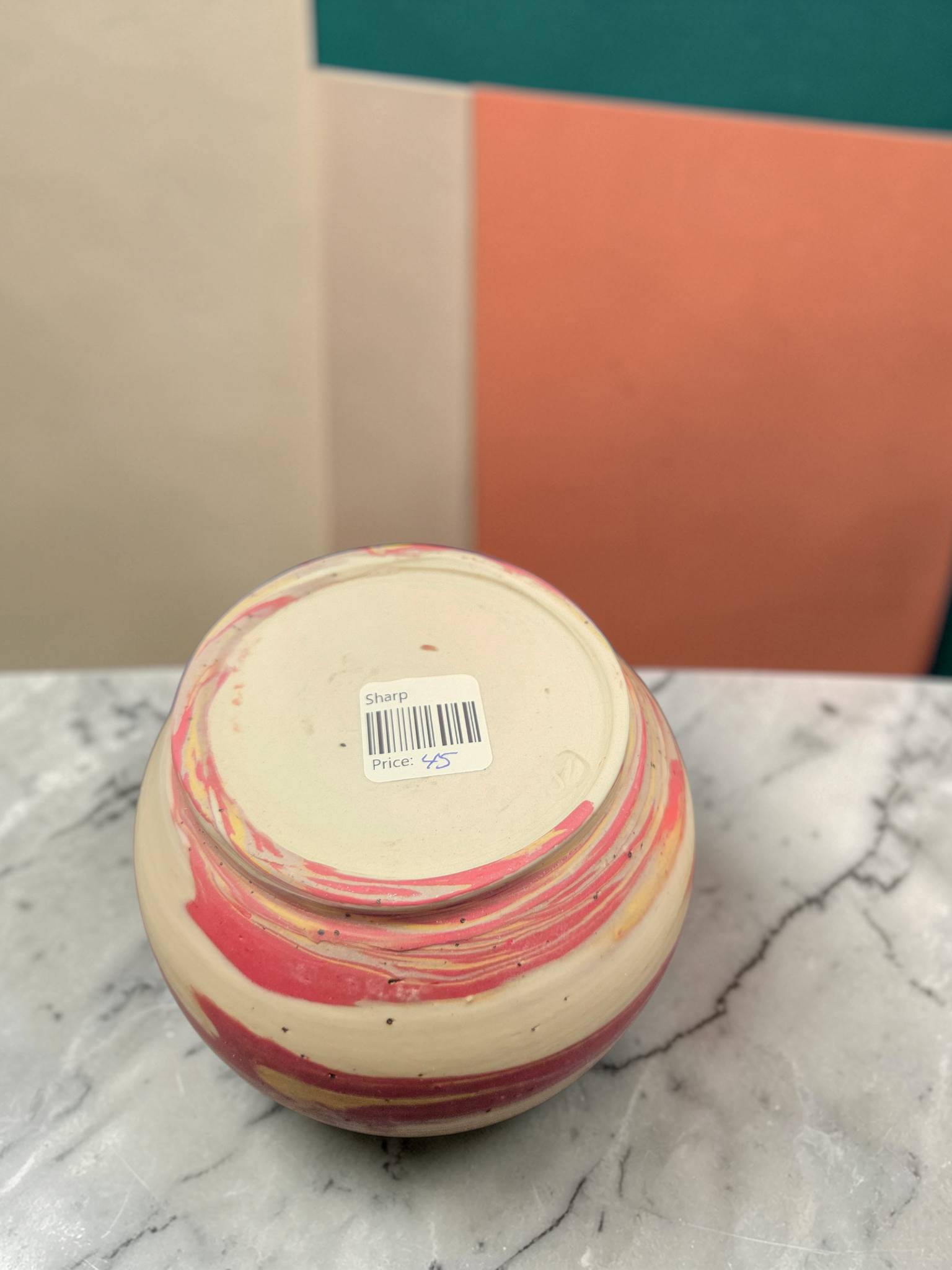 Red, yellow, and white chattered vase