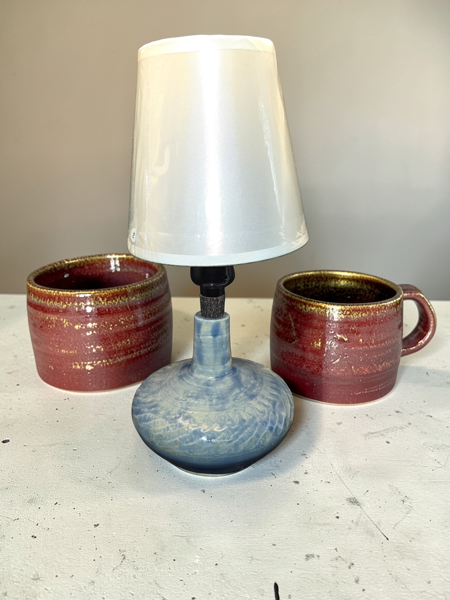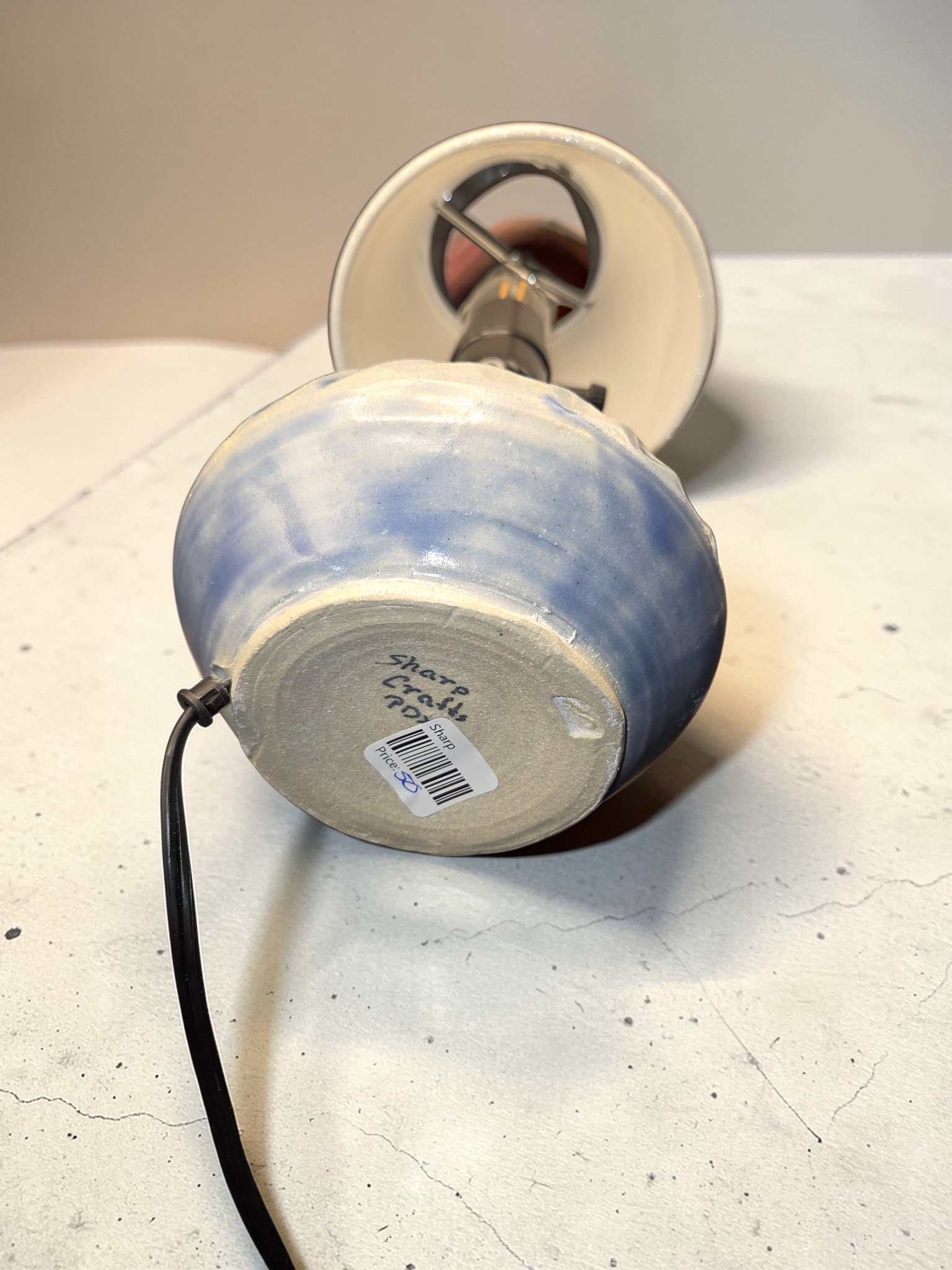 Light blue ceramic table lamp — a handcrafted piece by Debbie Sharp at Sharp Crafts PDX. Smooth, matte-glazed ceramic in a soft, sea-glass blue offers a calm, diffused glow perfect for bedside, reading nooks, or a living room side table. Thoughtful proportions and a subtle, tactile surface reflect the maker’s focus on carving techniques; each lamp is unique with gentle variations in tone and texture. Fitted with a standard socket and wiring for practical, everyday use. A quiet, elegant accent that brings handcrafted warmth and soft ambient light to contemporary and coastal-inspired interiors.
