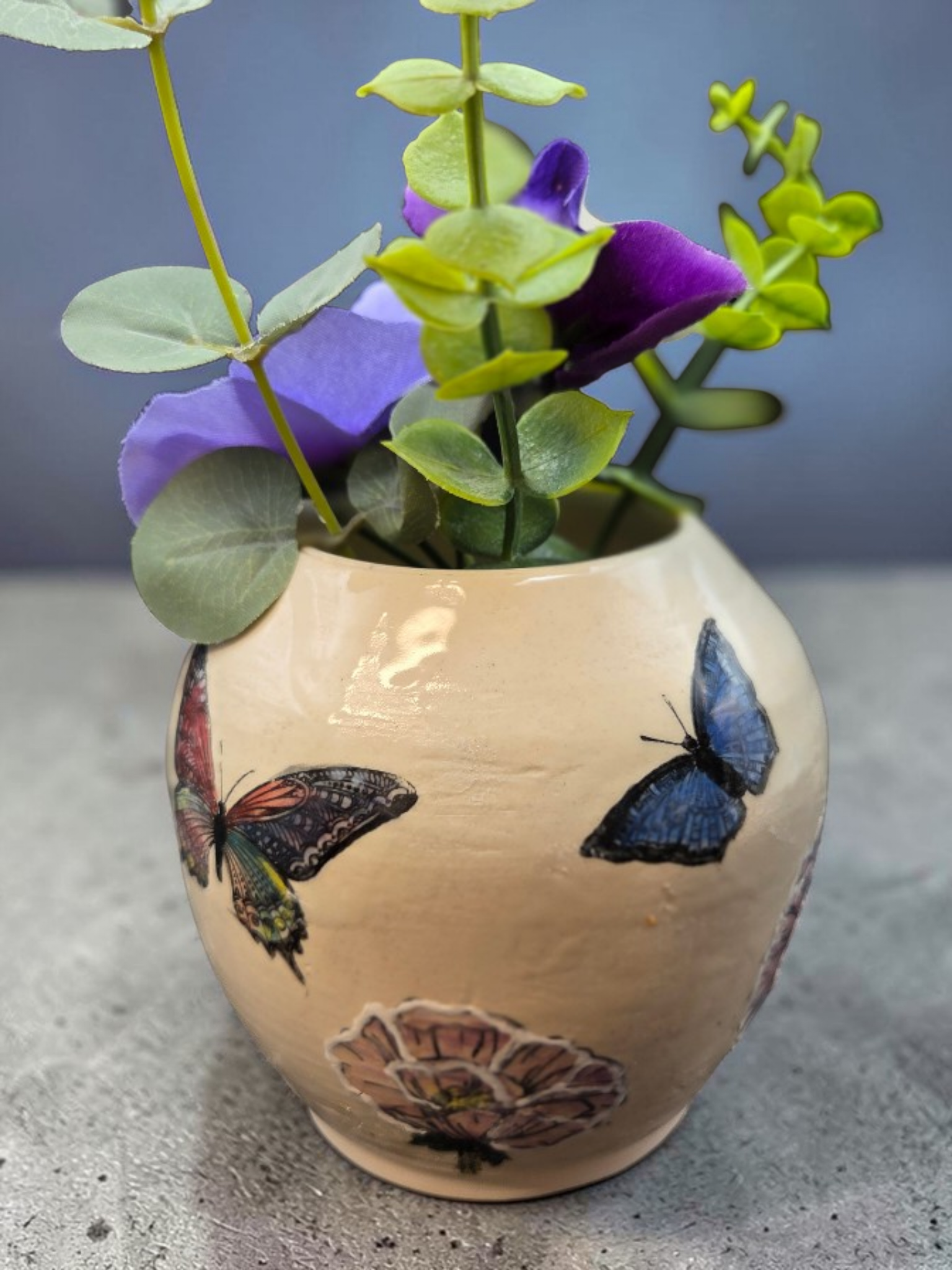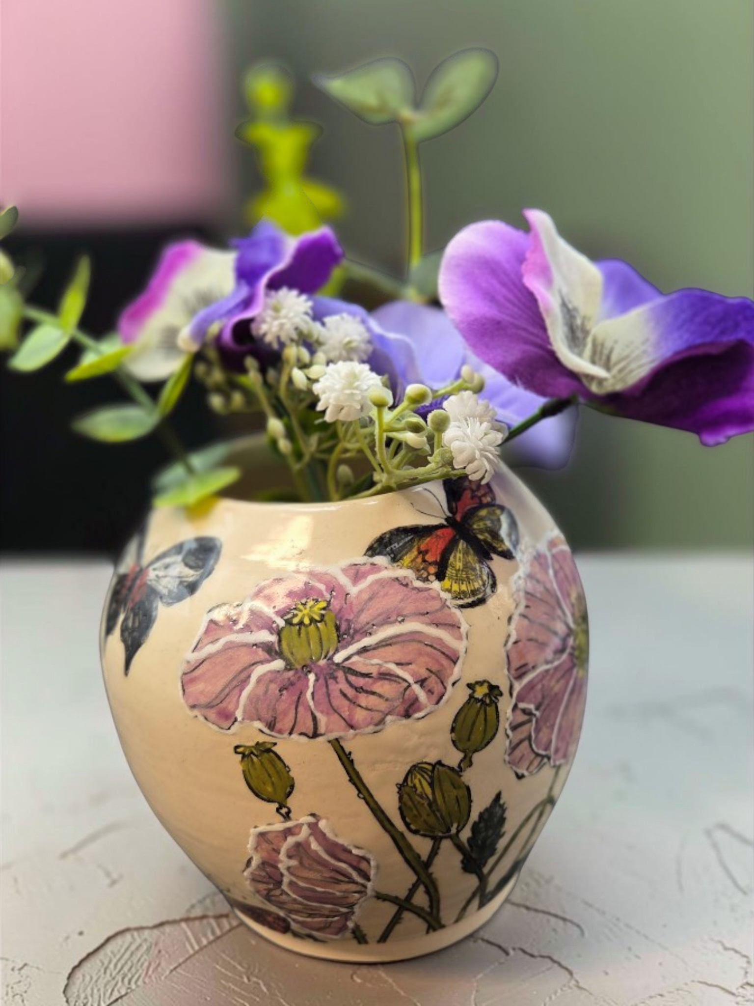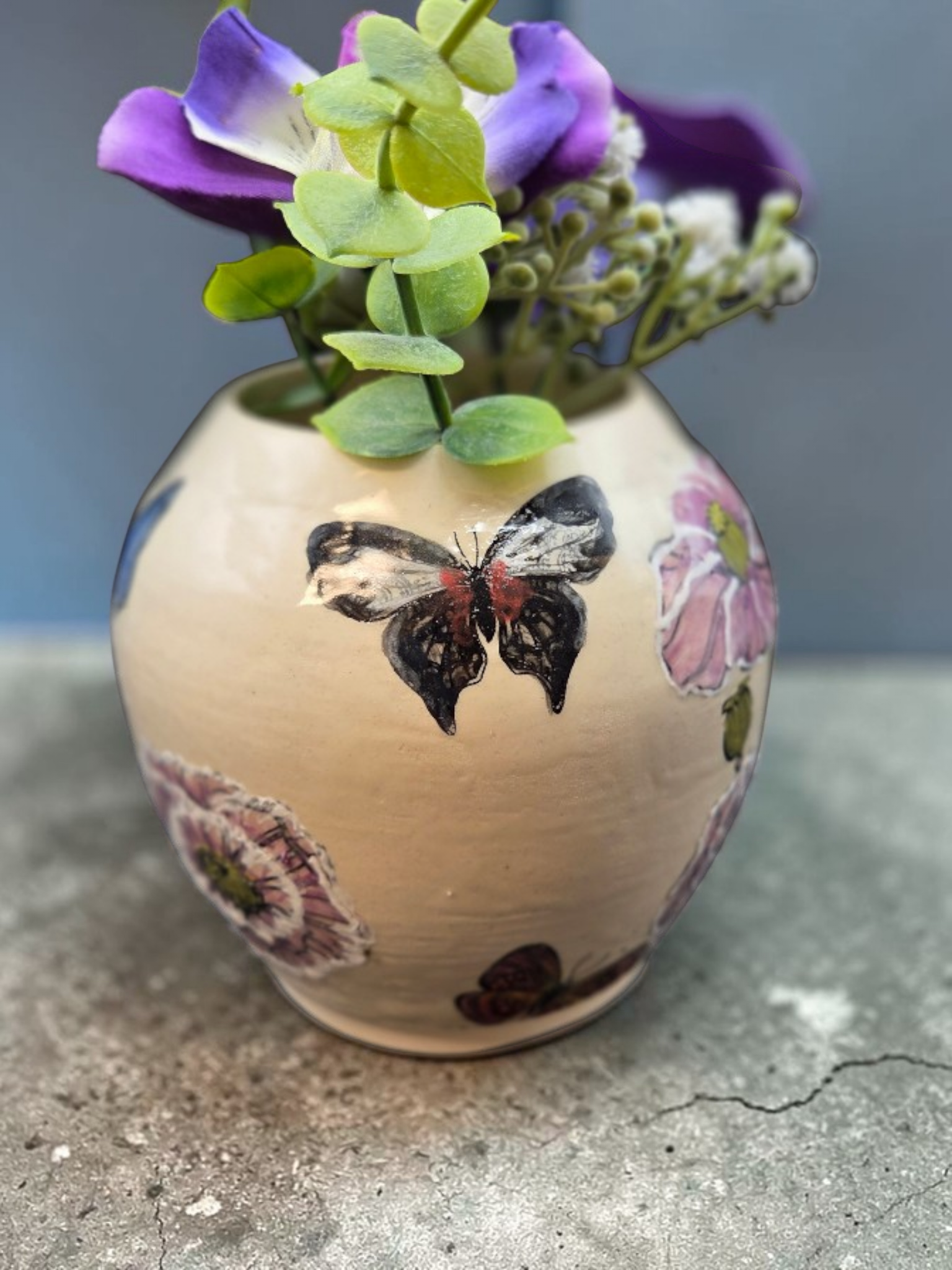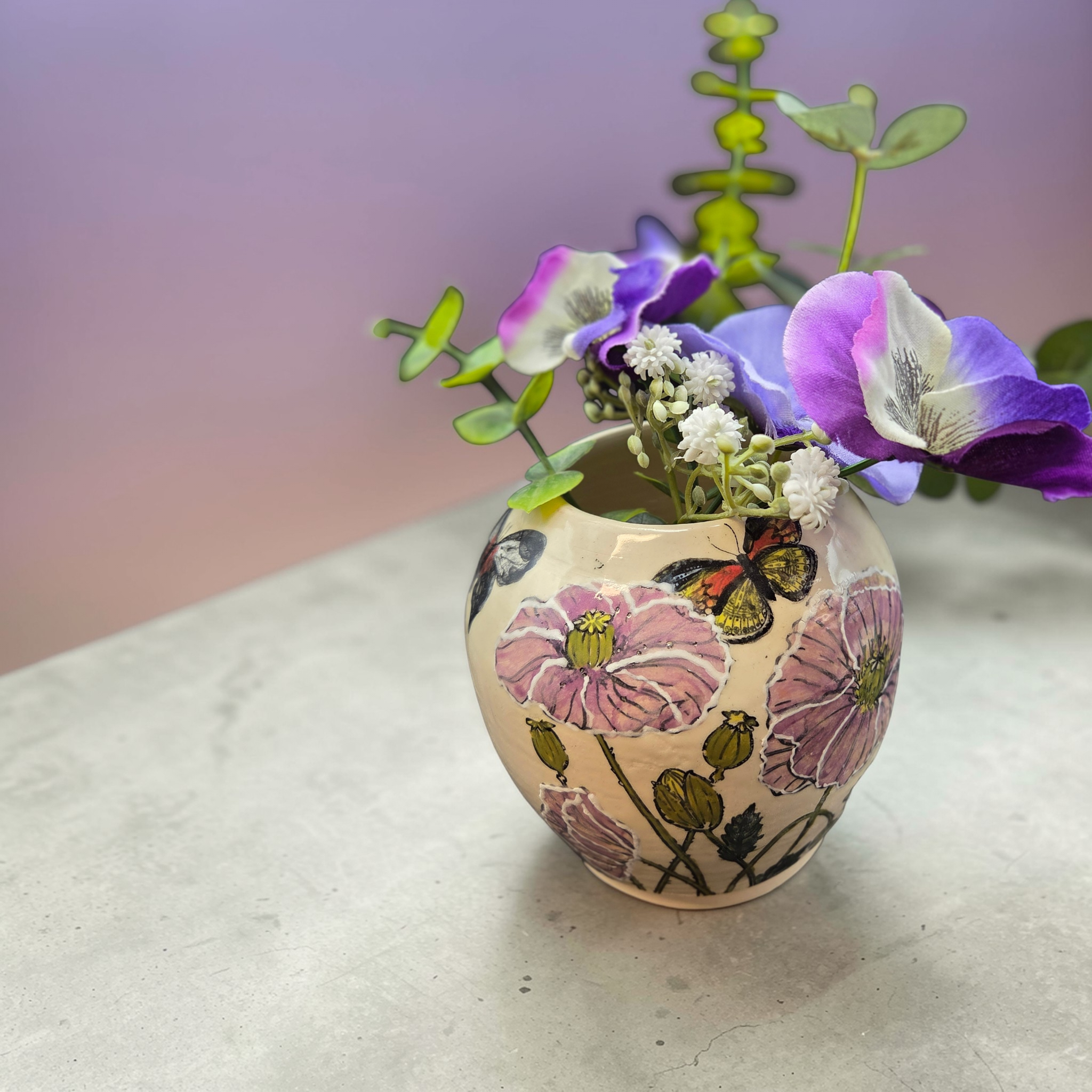Hand-painted stoneware vase featuring delicate butterflies and flowers. Wheel-thrown from durable stoneware and glazed with food-safe, lead-free colors, each piece is individually painted by hand for subtle variations and a one-of-a-kind finish. The design pairs soft botanical motifs with graceful butterflies, bringing a touch of nature and quiet charm to shelves, mantels, or as a centerpiece with fresh or dried stems. Measures approximately 8 inches tall; variations in color and brushwork make every vase unique. Crafted in Gresham, Oregon by Debbie Sharp.