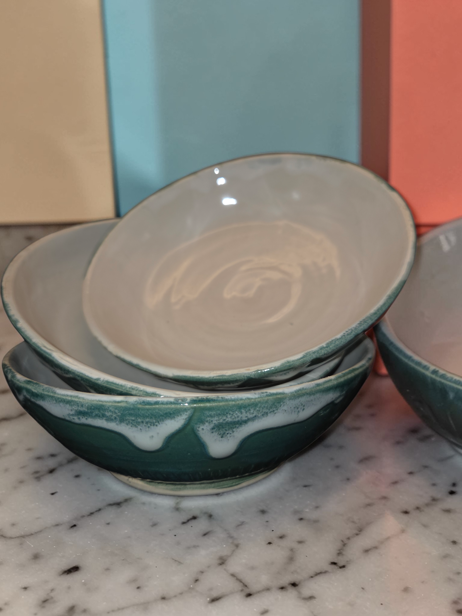 Green frosted stoneware bowls — hand-thrown, durable, and quietly elegant. Each piece is crafted from porcelainious clay and finished with green glaze and a soft frost that deepens the rich green tones while allowing subtle variations in texture and pattern to show. Ideal for everyday use or as a calm centerpiece, these bowls are microwave- and dishwasher-safe and resist chipping from regular use.Practical, tactile, and simply beautiful — a calm green that fits any table.